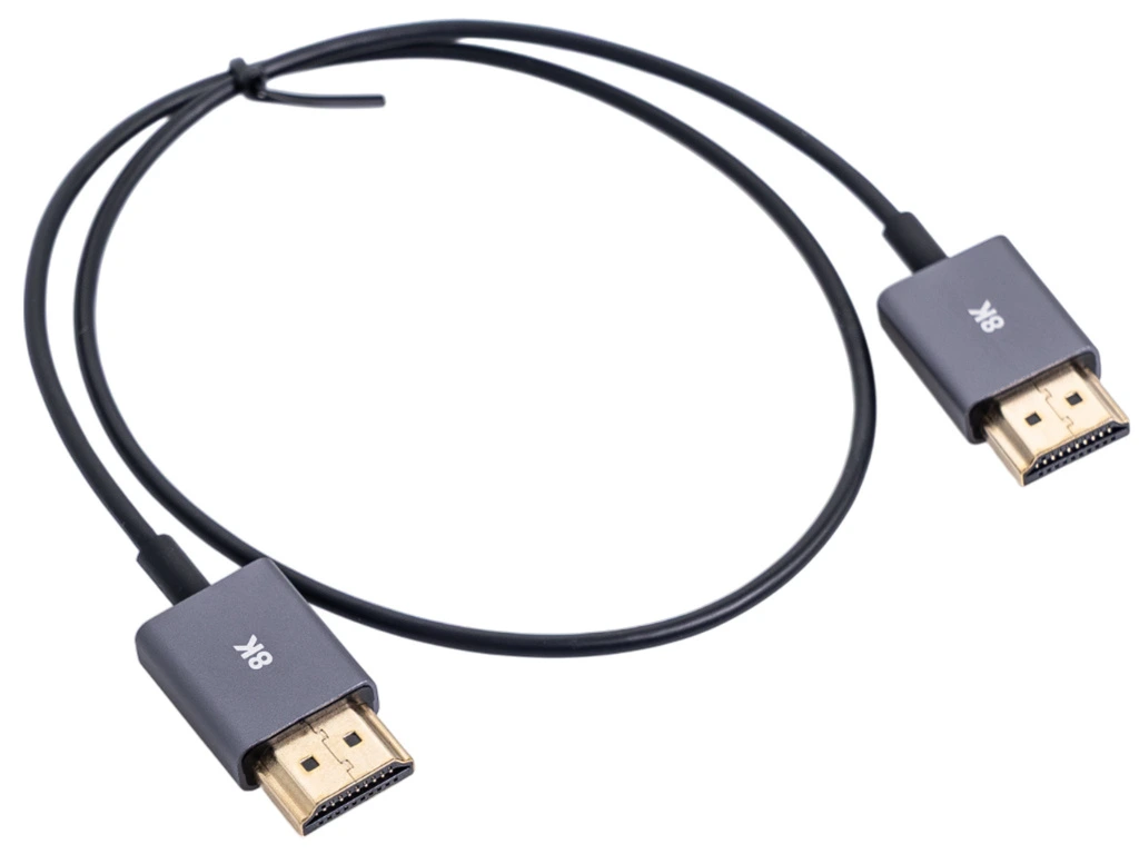 Vysokorychlostní ultra tenký s podporou až 8K@60Hz HDMI V2.1 kabel s pozlacenými konektory a délkou 80cm (⌀ 2,5mm). Lze použít pro náhledové monitory s nižším rozlišením (Full HD / 4K).